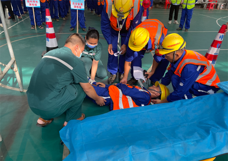 活動(dòng)現(xiàn)場,項(xiàng)目部安全總監(jiān)對(duì)綜合應(yīng)急救援演練方案進(jìn)行了詳細(xì)的講解。參訓(xùn)人員分組對(duì)施工中常見的觸電、高處墜落應(yīng)急救援、觸電事故應(yīng)急救援、各類消防器材的使用進(jìn)行了演練。醫(yī)護(hù)人員現(xiàn)場示范了中暑急救、胸外擠壓急救措施、人工呼吸方法、骨傷綁扎固定等應(yīng)急救援措施。通過形象生動(dòng)地講解示范和實(shí)踐演練讓參訓(xùn)人員深刻理解應(yīng)急救援知識(shí),掌握急救措施,提升事故防范處理能力,有效防范安全事故發(fā)生。