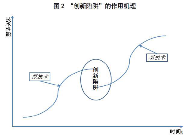“創(chuàng)新陷阱”正是產(chǎn)生于這種新舊技術(shù)的更替過程中(參見圖2)。具體來說,對于一家企業(yè),從原有技術(shù)軌道跨向新技術(shù)軌道是一件不容易的事情;企業(yè)越是在自己原有的技術(shù)專長上加以創(chuàng)新,便會在原有技術(shù)軌道上走得越遠(yuǎn);也正因?yàn)槿绱耍髽I(yè)也便越會延滯進(jìn)入新的技術(shù)軌道,進(jìn)而也越來越遭受舊技術(shù)極限的扼制。